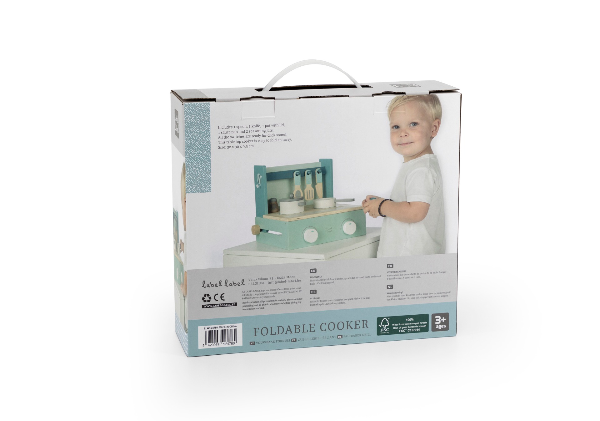 Dit mooie, compacte kookfornuis in Label Label stijl neemt je kindje makkelijk overal mee naartoe. Het vouwbare fornuis bestaat uit kwaliteitsvol FSC gecertificeerd hout en werd voorzien van prachtige kleuren met behulp van kindvriendelijke verf op waterbasis. Met deze mini keuken kan je kindje om het even waar en wanneer zijn/haar kookkunsten tonen. Alles is aanwezig om meteen aan de slag te gaan: braadpannetje en kookpotje met deksel en de bijhorende accessoires zoals spatel, mes, lepel en niet te vergeten peper- en zoutvat! Laat alles lekker stoven en pruttelen door de temperatuur te regelen met de klikkende draaiknoppen. Eénmaal klaar, vouw je het mini fornuis met een paar eenvoudige stappen op en kan alles binnenin geordend worden. Opgeruimd staat netjes! Het Label Label opvouwbaar kookfornuis met bijhorende accessoires neemt niet veel plaats in en neem je makkelijk overal mee naartoe. Tijdens het spelen krijgen kinderen de kans volledig op te gaan in hun eigen fantasie. Zowel hun creativiteit als verbeeldingskracht worden gestimuleerd, ze leren interageren en oefenen hun logische redeneringsvorm en oog-hand coördinatie.